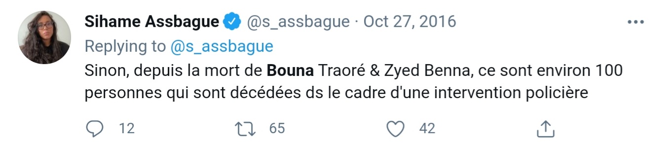 Sihame Assbague confond "ordre policier raciste" et corporatisme existant dans la majeure partie des professions, elle instrumentalise la mort de Zyed et Bouna (27/10/2005), elle apporte son soutien au comité Adama, elle fantasme une génération Le Pen opposée à une génération Zyed et Bouna. Enfin Siham Assbague cite le chiffre de 100 morts suite à des interventions policières depuis la mort de Zyed et Bouna. Soit 100 morts en 11 ans. Son chiffre confirme ce que j'ai déjà publié sur ce blog au sujet des violences policières, c'est un épiphénomène instrumentalisé à des fins politiques.