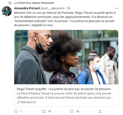 Voici 37 copies écran exposant les profils de ceux qui soutiennent le comité Adama et qui diffusent la propagande racialiste d’Assa Traoré. Ces tweets sont intéressants pour toute personne qui s'intéresse au fanatisme, au conditionnement des masses, à la propagande ou toute forme de manipulation cognitive. La liste est bien entendu non exhaustive car l'obscurantisme est un puits sans fond. Mention spéciale à Omar Sy qui récidive ou à Libération, capable de se contredire le même jour ! Voici les ennemis de la vérité et de la République Française :